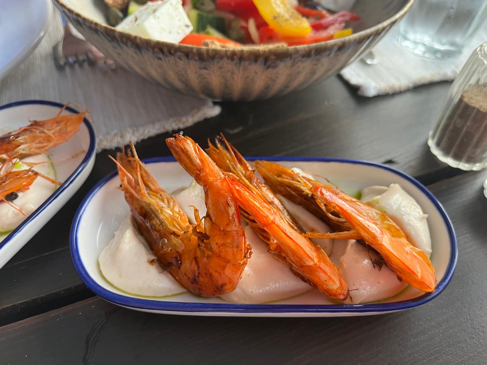 Natürlich durfte gutes Essen nicht fehlen. Schon am ersten Abend gab es frisch gegrillte Garnelen auf einer cremigen Sauce, dazu ein klassischer griechischer Salat mit großen Stücken Feta, wie er sein muss.