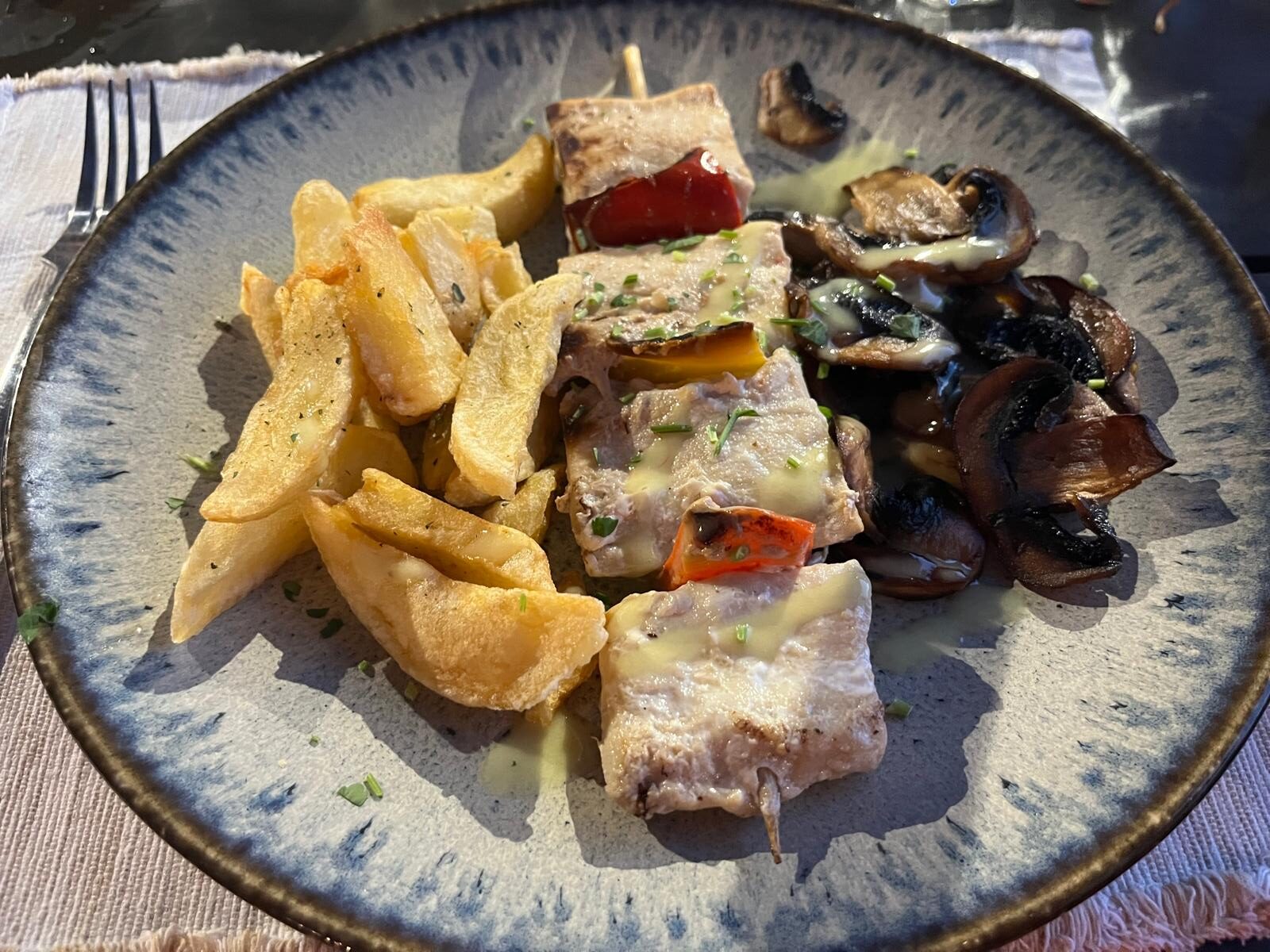 Später folgte ein Teller mit Fleischspießen, Kartoffelspalten und Pilzen, herzhaft und bodenständig, genau das Richtige nach einem langen Tag voller Gespräche.